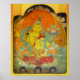 Manjushri sur panneau de bois, Katmandou, Népal. Manjushri est décrit comme un beau prince de 16 ans. Il tient dans sa main gauche la tige d'une fleur de lotus bleu sur laquelle repose l'une des écritures de Prajnaparamita, qui traite de la réalisation de Prajna, ou sagesse. Avec sa main droite, il manipule une épée flamboyante de sagesse pour vaincre l'ignorance.