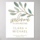Cette affiche de bienvenue à l'eucalyptus veiné d'or est parfaite pour un mariage élégant. Le design simple et somptueux présente une parties scintillant en faux or superposant les branches de feuilles verts d'olivier. Customisez l'affiche avec le nom de la mariée et du marié, ainsi que la date et l'emplacement du mariage. Remarque : Ce design ne comporte pas de véritable parties scintillant en or. C'est un graphisme de haute qualité fait pour ressembler à un shimmer d'or.