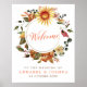 Une enseigne de charme pour accueillir vos invités dans votre mariage d'automne. Ce design présente une belle couronne d'aquarelle de fleurs automnales et de feuilles en orange, jaune et vert, au centre de laquelle est "bienvenue" en orange police calligraphie moderne. Personnalisez avec vos noms et votre date de mariage.