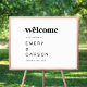 Cette affiche d'accueil mariage de typographie noire moderne est parfaite pour un mariage simple. Le design minimaliste noir et blanc présente une police rétro mais contemporaine, avec une atmosphère bohème rustique unique. Parfait pour toute saison. Gardez-le minimal, en l'état, ou ajoutez vos propres graphiques et illustrations. Customisez l'affiche avec le nom de la mariée et du marié, et la date du mariage.
