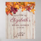 Tombez amoureux de ce panneau de fête de fiançailles sur le thème de l'automne. Ce panneau présente un fond en bois rustique blanc avec des feuilles colorées en rouge, orange et jaune.