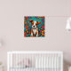 Adorable art de l'air blanc avec un chien chiot brun et blanc entouré de fleurs d'art populaire en rose, orange et violet.