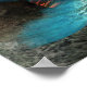 À aqua-haired mermaid sitting on a rock underwater greets a friendly dolphin.