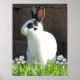 Mini rex dans notre jardin avec marguerites regardant autour du soleil du matin. Photo de Carolyn Hidalgo