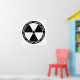 Weißes Poster mit schwarzem Strahlensymbol, umgeben von "Gefahr - Strahlung" in wiederholtem Text.