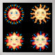 Vier Sonnenkollektoren in leuchtend gelb blau rot und orange auf einem schwarzen schwarzen Boden in diesem Poster.