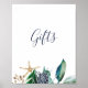Ce panneau de cadeaux de verdure nautique moderne est parfait pour un mariage ou une douche de mariée de croisière ou de plage. Le design botanique présente de belles feuilles vertes avec des fleurs bleues marine et des accents d'étoiles de mer dorées, lui donnant une ambiance balnéaire.