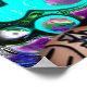 Rocker punk mohawk femme avec mohawk coloré, tatouages et piercings et abstrait art fluide arrière - plan en noir, violet, vert et bleu.