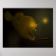 Grande affiche d'un gigantesque et hideux poisson pêcheur dans les profondeurs troubles de la mer, qui barbe ses dents féroces et brille une lueur jaune menaçante sur un sous-marin qui passe.