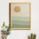 Cette oeuvre minimaliste présente un paysage abstrait serein avec un soleil chaud et de couleur pêche placé dans le coin supérieur gauche contre un ciel beige doux. Ci-dessous, des collines ondulées sont dépeintes dans des tons vert pâle, créant un sentiment de profondeur et de tranquillité. Les formes simplifiées et la palette de couleurs apaisantes évoquent une atmosphère paisible et naturelle, parfaite pour un décor moderne ou comme un arrière - plan apaisant pour des projets créatifs.