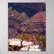 Photo d'une formation de pierre avec un arbre qui pousse à partir d'une des fissures. Un petit observateur est perché près du point de la formation, avec vue sur le canyon. L'arrière - plan est un mur de pierre rouge qui descend profondément dans la terre, avec des taches de croissance verte éparpillées autour. Copyright ©2019 Kimberly J Tilley.