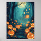The pathway lined with pumpkins creates a mysterious Halloween atmosphere with a haunted house surrounded by jack-o’-lanterns under a bright full moon.