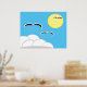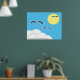 Drei Möwen stürzen in einem hellblauen Himmel. Untere links Ecke sind flauschige weiße Wolken mit grauem Schatten. Kleiner/weiter Möwe fliegt vor der gelben Sonne.