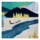 Un paysage numérique aux couleurs et textures vives montrant un musher avec une équipe de traîneau à chiens et un lever de soleil rose brillant dans les tons bleu, or, cyan et jaune.