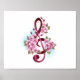 Pink treble clef with delicate, detailed pink Japanese cherry blossoms against white background painted over with light blue paint Blooming pink sakura.