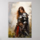 A woman in shining armor stands in a natural setting, exuding strength and determination. Her long hair flows in the breeze as she holds a sword, surrounded by soft, atmospheric light and foliage.