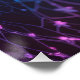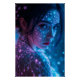 Portrait d'une femme avec son visage incliné dans une vue de trois quarts derrière, mais ses yeux regardent directement le spectateur. Un côté de son visage brille de lumière magique bleue et rose, mettant en évidence des motifs lumineux complexes et des pétales de fleurs délicats tissés dans ses cheveux. Mystérieux, captivant et enchanteur.