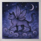 This poster features a mystical cat with delicate butterfly wings walks gracefully on swirling clouds beneath a crescent moon and starry night, symbolizing magic and transformation.