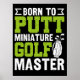 Cette illustration audacieuse célèbre un maître du minigolf. "BORN TO" est en haut en blanc, encadré par des accents géométriques. Ci-dessous, "PUTT" s'affiche en évidence dans une police verte vibrante et en détresse. "MINIATURE" en blanc mène au "GOLF" en vert, accompagné d'un sac de golf rempli de clubs en blanc. Le texte en bas "MASTER" est en blanc. Le design général est d'une esthétique robuste et obscure, parfaite pour un mini-golfeur passionné.