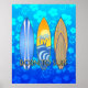 Retro Est Né Au Surf. 3 planches de surf de style vintage avec le message Born To Surf. Arrière - plan bleu océan avec tortues de mer hawaïennes de Honu et fleurs d'hibiscus bleu.