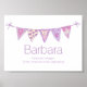 Joli drapeau à bottes dessiné à la main affiche du nom de l'art parfait pour une chambre d'une fille ou salle de jeux dans les tons violet, rose, jaune crémeux et blanc. Personnalisez avec votre propre initiale de votre enfant sur le drapeau du milieu, nom et nom signifiant pour une touche vraiment personnalisée à la chambre ou à la crèche de votre enfant, cet exemple est pour le nom Barbara Un bel étranger. Exotique, gentille et absolument captivante. Un imprimé d'affiche mignon, idéal pour une nouvelle petite fille, un baptême ou un cadeau de baby shower. Dessin unique, art graphique et design par Sarah Trett pour www.mylittleeden.com