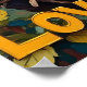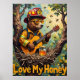 Cette oeuvre d'art chaleureuse capture un ours habillé en équipement de pompier, y compris un casque et des lunettes de soleil, jouant d'une guitare acoustique confortablement assis dans un nid d'oiseau. Les abeilles volent à proximité, et un pot de miel avec un petit citrouille repose dans le nid. L'arrière - plan dispose d'une forêt animée sous un ciel chaud. Les traits épais et texturés de la peinture ajoutent à la qualité attachante de l'image, avec les mots "Love My Honey" en vedette ci-dessous.