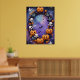 Cette affiche captivante présente une couronne festive d'Halloween ornée de lanternes de jack-o’ souriantes, de crânes blancs étranges, de mystérieuses fleurs violettes et de chauves-souris noires nocturnes dressées sur un fond d'une brume obsédante. Parfait pour ajouter une touche de charme saisonnier à tout espace