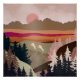 Un paysage abstrait avec des couleurs et des textures uniques montrant un paysage naturel avec un soleil levant et deux oies dans les tons orange, beige, marron et rose.