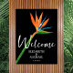 Un poster de bienvenue mariage présente un oiseau exotique tropical du paradis avec vos détails mariages en lettrage chic accentuer ce poster noir. TÉLÉCHARGEMENT INSTANT et/ou IMPRIMÉ. CORRESPONDANCE d'objets dans notre collection.