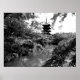Photographie en noir et blanc d'une pagode japonaise s'élevant au-dessus d'un beau jardin avec un étang. La scène est au temple Toji de Kyoto, au Japon. La pagode est un symbole de Kyoto.
