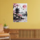 Ce tableau représente un paysage japonais saisissant avec une pagode à plusieurs niveaux sur un rivage rocheux. Une grande lune rose vif domine le ciel, avec un troupeau d'oiseaux qui le traverse. Des cerisiers fleuris de fleurs roses sont éparpillés un peu partout et des pétales flottent dans l'eau calme. Une montagne enneigée est visible dans l'arrière - plan brumeux, ajoutant à l'atmosphère sereine et mystique de l'oeuvre.