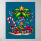 Poster avec une image de vacances saisonnière. Un palmier tropical orné de lumières festives surmonté d'une étoile. Un sucre de canne géant rouge et blanc qui sort du sable. Cadeaux de Noël sous l'arbre. Whimsical et amusant.