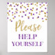 Pancarte s'il vous plaît vous servir pour une baby shower, une fête de mariage, un anniversaire ou un mariage dans un motif de confettis or et pourpre foncé. Veuillez noter que l'effet pailleté est un effet photographique uniquement.