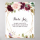Cette pancarte de pot de date florale géométrique verte de Bourgogne dorée est parfaite pour un mariage rustique. Le design présente des bouquets de fleurs élégants verts, roses, violets, rouges et de Bourgogne dessinés à la main, ornant des cadres géométriques dorés, inspirant la classe et la beauté.