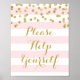 Pancarte ou affiche 'Servez-vous' pour buffet de desserts pour une baby shower, une douche de mariée ou un mariage dans un motif à rayures rose clair et blanc avec des confettis dorés, veuillez noter que l'effet pailleté or est uniquement un effet photographique. Parfait pour une baby shower, un mariage ou une douche de mariée.