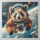 Une affiche fantaisiste et aventureuse avec un adorable panda en costume d'astronaute, qui s'envole à travers la vaste étendue de l'espace. Le panda, habillé d'une combinaison spatiale avec un casque clair, flotte sans poids parmi les étoiles. Son expression aux yeux larges capture un sentiment d'émerveillement et d'excitation alors qu'il dérive à travers le ciel.