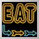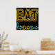 EAT art rétro basé sur une enseigne de restaurant néon vintage. Les lettres sont jaune et rouge, les flèches sont bleu, rouge et jaune. Un art publicitaire amusant et amusant pour les gens qui cuisinent ou mangent.
