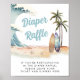 Joli baby shower à thème surf tombola de tombola avec une scène de plage tropicale aquarelle avec des palmiers, des rivages sablonneux, des planches de surf turquoise et marron et "Diaper Raffle" un scénario amusant bleu rétro.