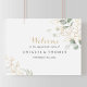 Ce panneau de bienvenue à la fête de fiançailles à feuillage vert doré est parfait pour une célébration de fiançailles simple. Ce design artistique présente un feuillage doré et vert dessiné à la main à l'aquarelle, inspirant une beauté naturelle.