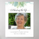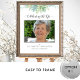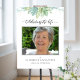 Mes condoléances pour votre perte. Honorez votre proche avec un élégant panneau de bienvenue photo de funérailles délicat et attentionné avec un design de verdure aquarelle peinte à la main exquise sur le dessus et la phrase "Célébrer la vie de" en calligraphie moderne gracieuse. Choix de plusieurs tailles. Feuillage et taches aquarelles de couleur turquoise pâle, bleue et verte. Faire-part de funérailles/célébration de vie, livre d'or, cartes de remerciement et programme coordonnés disponibles. Fait partie de notre collection "Funérailles délicates, Mémorial".