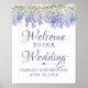 Accueillez vos invités avec une belle pancarte d'accueil. Les fleurs de glycine violette et bleue se combinent à la verdure douce pour créer une belle bordure supérieure. Bienvenue à Notre Mariage est écrit dans une combinaison de script fluide et de lettres de bloc chic et moderne. Facile à customiser.