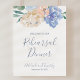 Ce panneau de bienvenue pour dîner de répétion de florales bleu poussiéreux est parfait pour une répétition de mariage de printemps ou d'été. Le design délicat présente des pivoines bleu clair disposées avec des fleurs pêche et crème dans un magnifique bouquet.