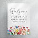 Accueillez les invités à la fête de mariage avec ce magnifique panneau floral de fleurs sauvages facile à personnaliser avec le nom de la mariée et la date.