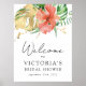 Accueillez les invités à la douche de mariée avec ce magnifique panneau floral tropical facile à personnaliser avec le nom de la mariée et la date.