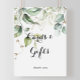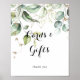 Ce panneau de cartes et cadeaux de végétation dorée élégante est parfait pour un mariage moderne ou une fête de mariage. Le design présente des feuilles d'eucalyptus vertes botaniques et dorées dessinées à la main, inspirant une beauté artistique.