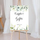 Cette enseigne de cartes et cadeaux vert eucalyptus aquarelle est parfaite pour une douche mariage ou nuptiale rustique. Cette conception artistique présente un feuillage vert d'eucalyptus dessiné à la main, aquarelle, inspirant la beauté naturelle. Faites la ligne de texte au bas du panneau vous-même en incluant la date, les noms de la mariée et du marié ou un message court comme "Merci". Ce signe peut compléter un mariage, un événement ou une fête.