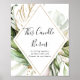 Ce panneau de cierge géométrique or tropical est parfait pour un mariage à destination. Le design présente une peinture à l'aquarelle dorée et verte de feuilles de palmier et de bananier avec des fleurs roses regroupées en bouquets, ornant un cadre géométrique.