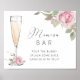 Panneau de mimosa de douche de mariage présente des roses roses, de la verdure et un verre à champagne.