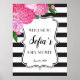 Des rayures modernes en noir et blanc avec des fleurs roses rendent ce baby shower signe d'accueil élégant et accueillant.