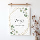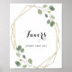 Ce panneau de faveurs de calligraphie moderne géométrique doré est parfait pour un mariage rustique ou une douche de mariée. Le design présente des branches et des feuilles de eucalyptus vert botanique dessinées à la main ornant un cadre élégant.